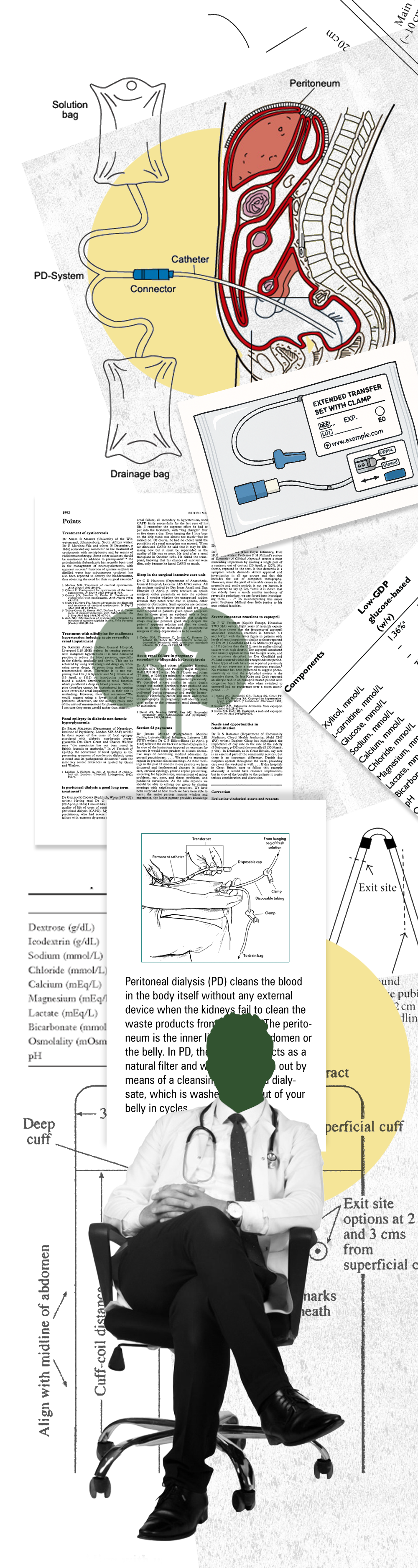 During each procedure, sterile cleansing fluid containing water, salt, and other additives is sent into the abdomen through this tube to filter the blood from a bag. This solution is called the dialysate. This solution filters the waste products from the blood vessels in the abdomen. As your blood flows naturally through the area, extra fluid and waste products are pulled out of the blood vessels and into the belly area by the dialysate (almost like a magnet). The solution is present in the body for about 4-6 hours. This period is called dwell time. After filtration of the blood, the fluid is drained through the catheter into the bag. The repeated process of sending the dialysate into the peritoneum to filter the blood and discard the filtered products collected in the blood is called the exchange.